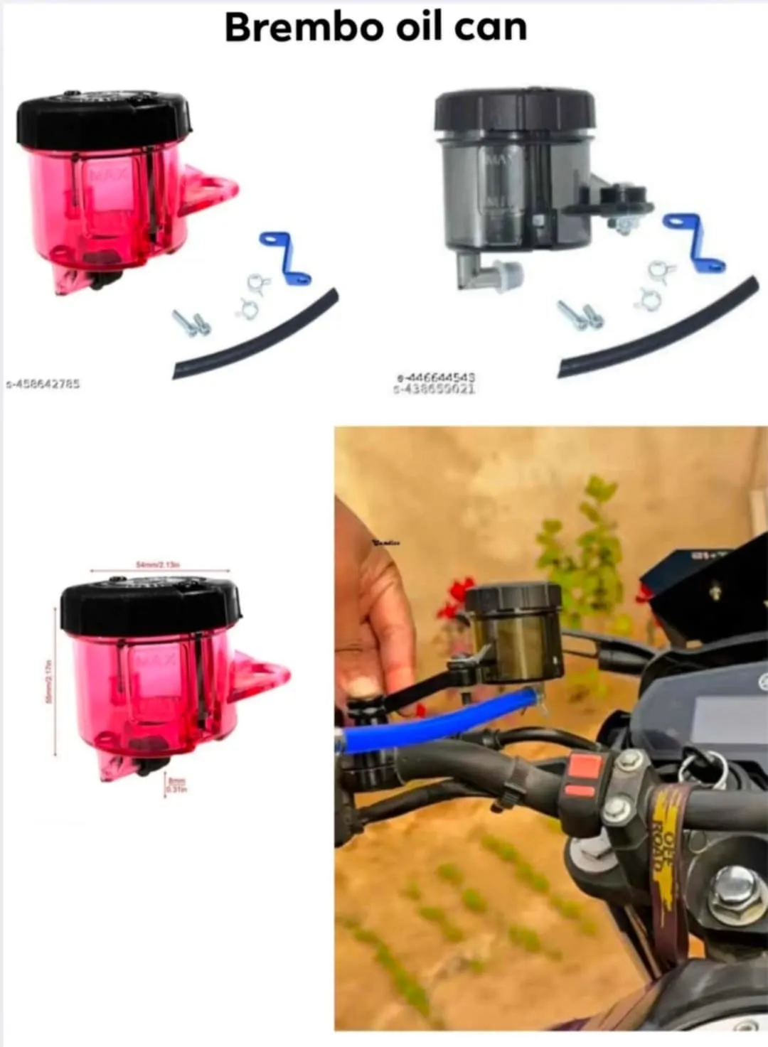 best quality ,limited stock inbox me in WhatsApp for ur order ✅bullet shape indicator: 450/- ✅phone holder: 800/- ✅Brembo oil can:900/- ✅helmet wings(universal):550/-