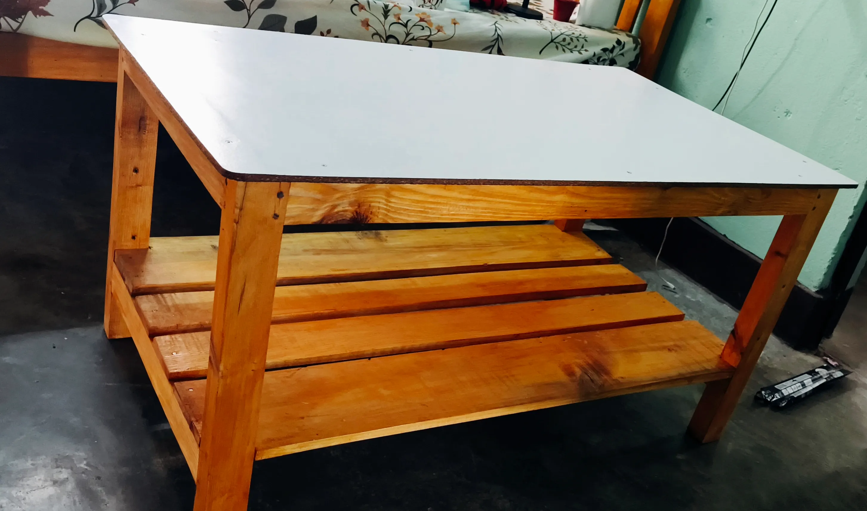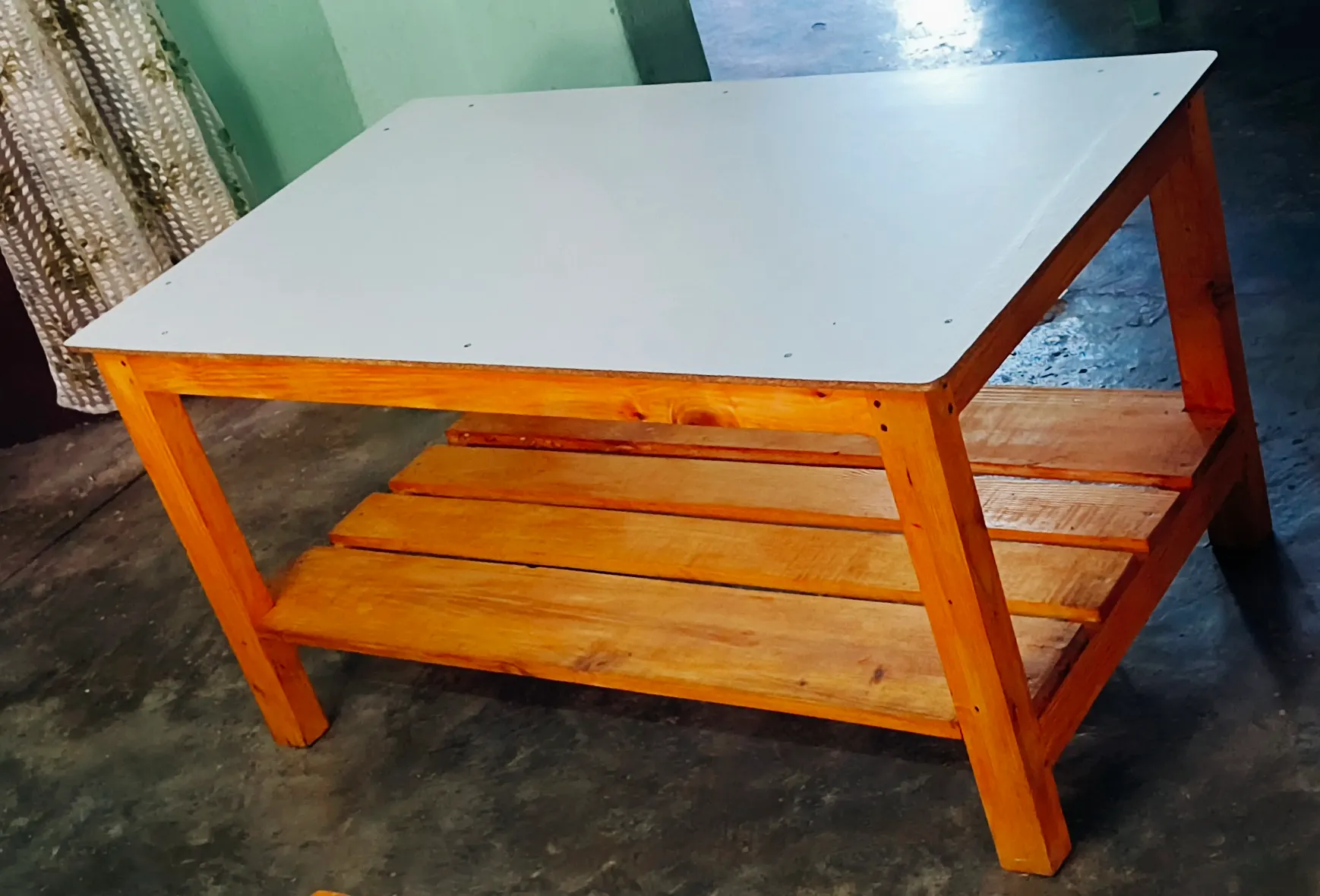 homemade table with white board topping